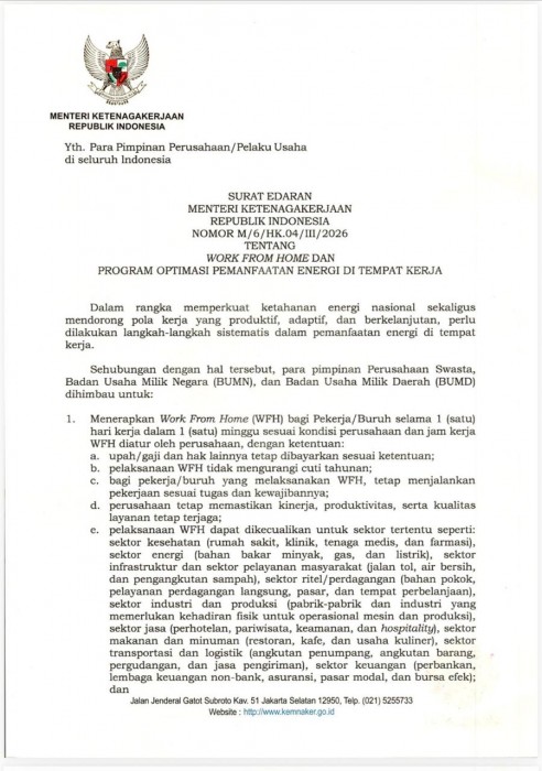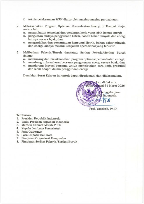 5. Pengecualian Sektor: Sektor-sektor strategis seperti kesehatan, energi, infrastruktur, ritel, industri manufaktur, jasa perhotelan, transportasi, dan keuangan dapat dikecualikan dari ketentuan WFH ini.
