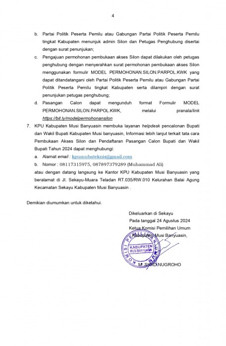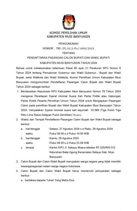 Pengumuman Pendaftaran Calon Bupati dan Calon Wakil Bupati Musi Banyuasin