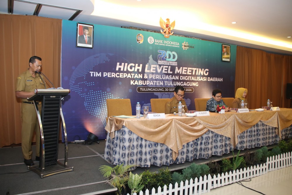 Pj Bupati Bupati Tulungagung Dr. Ir. HERU SUSENO, M.T buka kegiatan High Level Meeting (HLM) Tim Percepatan dan Perluasan Digitalisasi Daerah (TP2DD) Kabupaten Tulungagung bertempat di Ruang Nara Lojikka Hotel Tulungagung. , dihadiri oleh para anggota TP2DD Kabupaten Tulungagung. Tanggal 30 September 2024